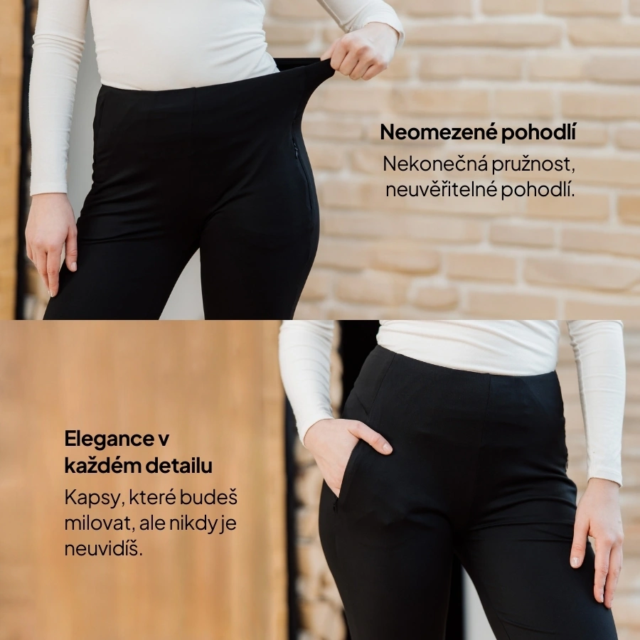 Poskytují elegantní střih, který zdůrazňuje ženské křivky, a zajišťují profesionální vzhled. Díky vysokému elastickému pasu a lehké látce zaručují pohodlí po celý den a snadný pohyb.