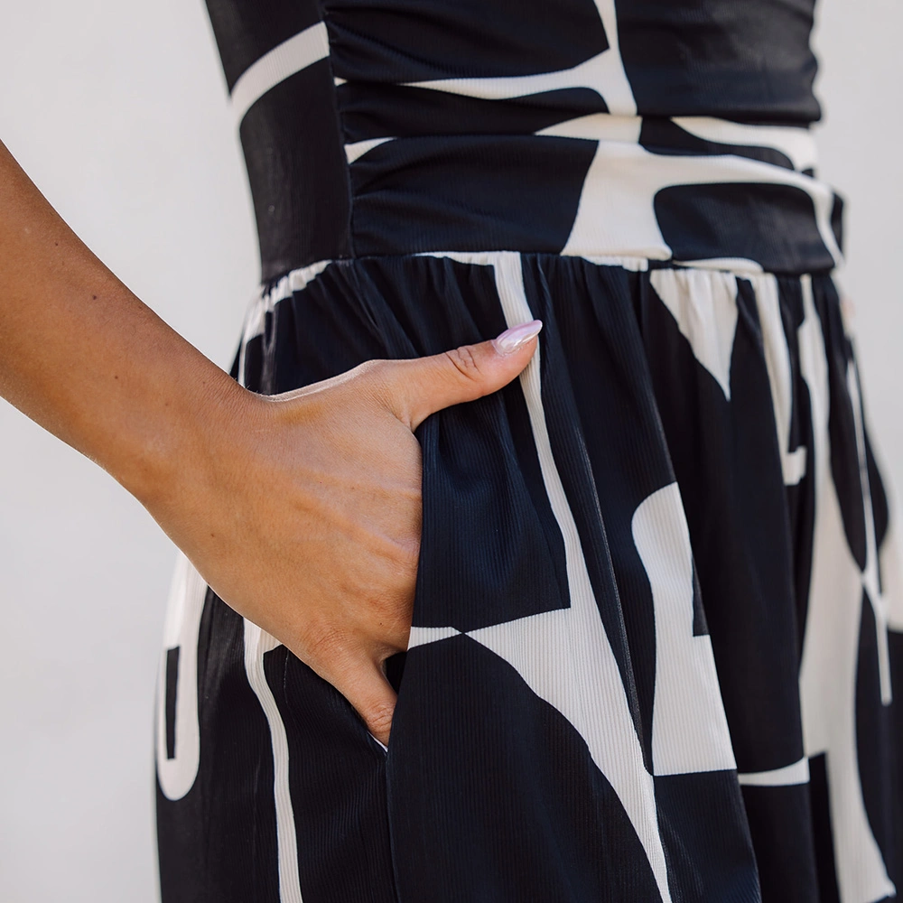 - Pleated waistband - emphasizes the waistline and adds texture and visual interest