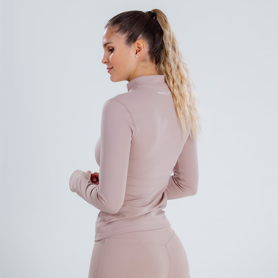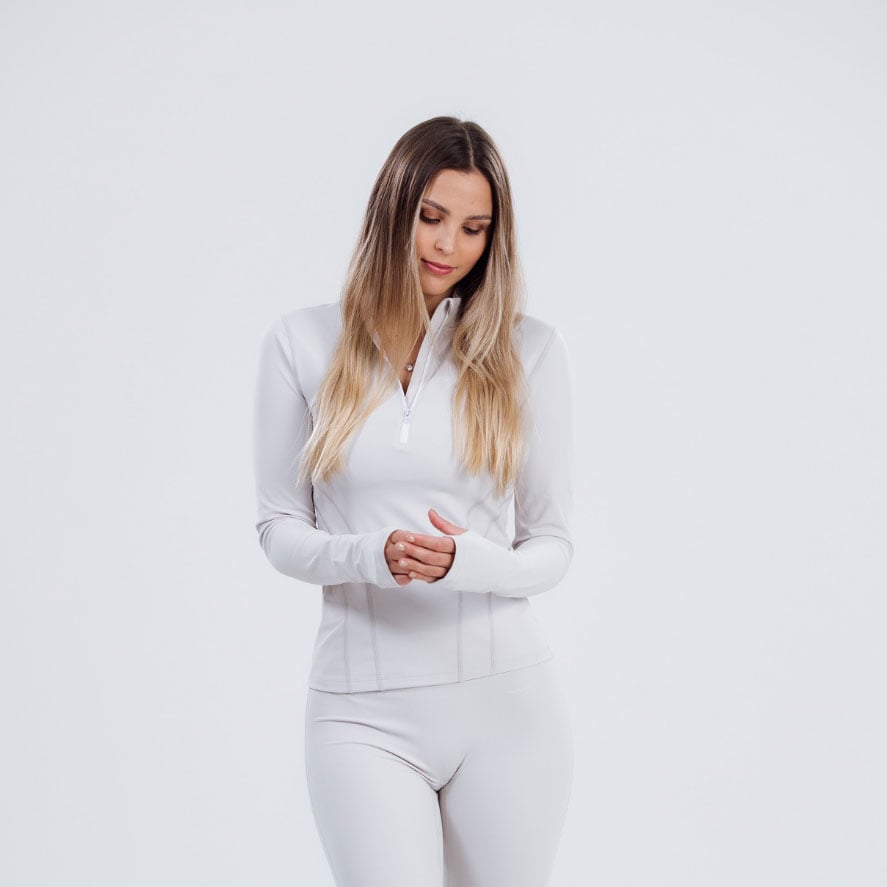 Seamless leggings with discrete scrunch, cropped zip-up, and T-strap bra for a sleek look.