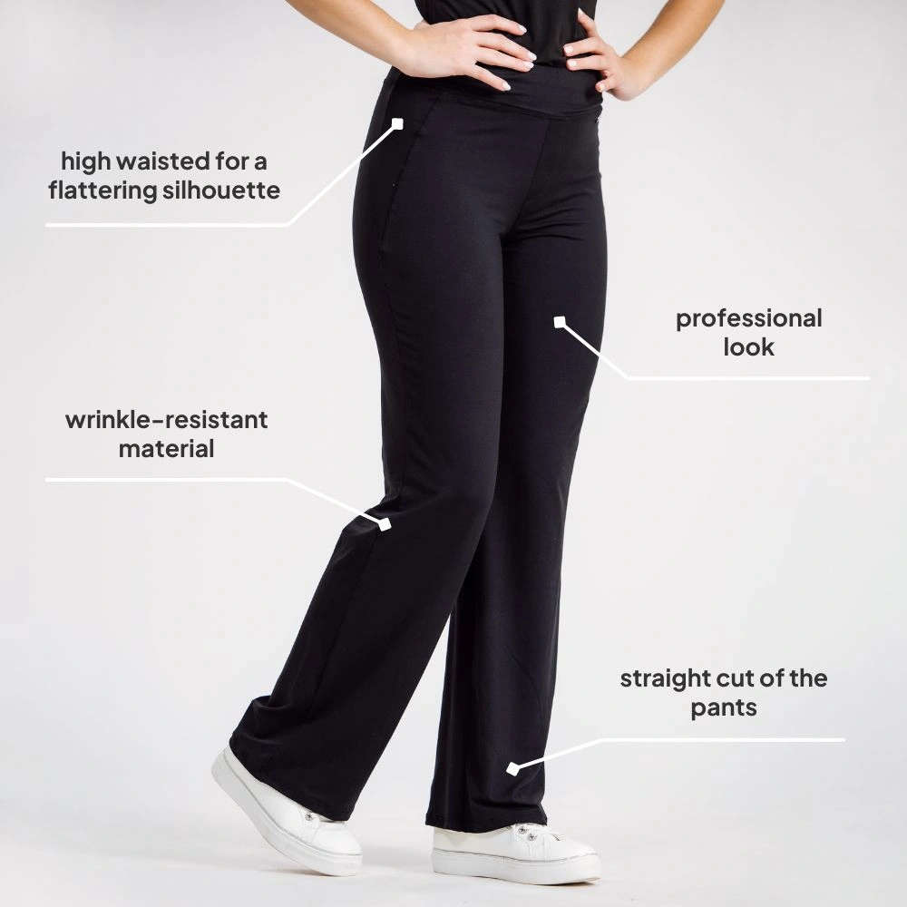 They offer a tailored fit that accentuates the feminine silhouette, delivering a neat and professional look. With a high, elasticated waistband and lightweight material, they ensure all-day comfort and easy movement.